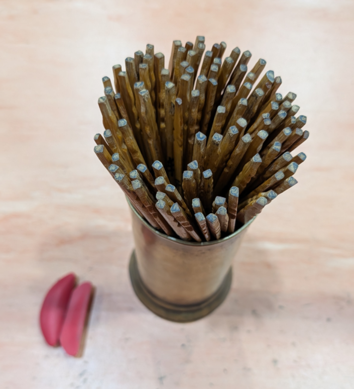 装在木制容器中的100支编号竹签。